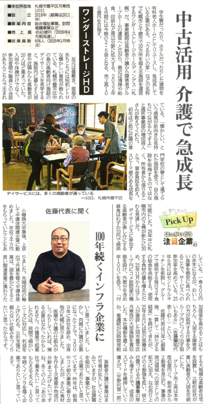 ワンダーストレージホールディングス株式会社(WSH)は、北海道新聞の朝刊にて「中古活用×介護」をテーマにした成長企業として紹介されました。 記事では、既存建物を活用した介護事業の展開や、地域に根ざしたサービスの取り組みが取り上げられています。今後も持続可能な福祉インフラの構築を目指し、事業を推進してまいります。